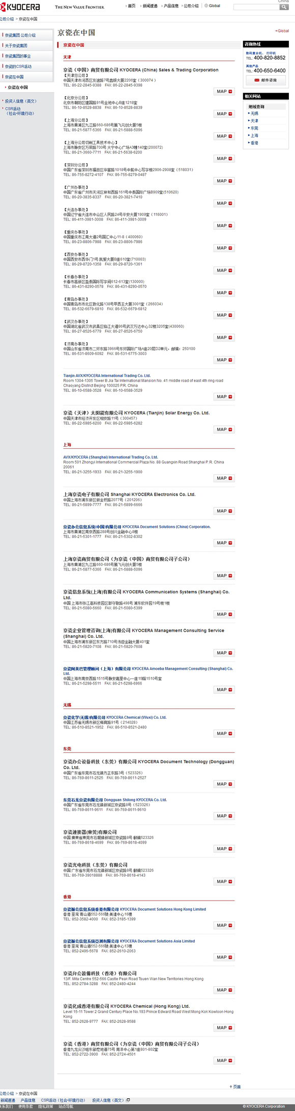 2月25日13时,记者再次进入京瓷集团九游官网网页版官网,发现网页中“京瓷各地分支机构”的按钮已经消失,该按钮下原有的链接“京瓷在中国”、“全球网点”、“日本网点”只剩“京瓷在中国”。