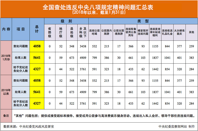 2018年1月全国查处违反中央八项规定精神问题4058起-九游官网网页版