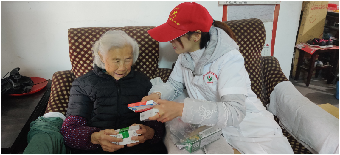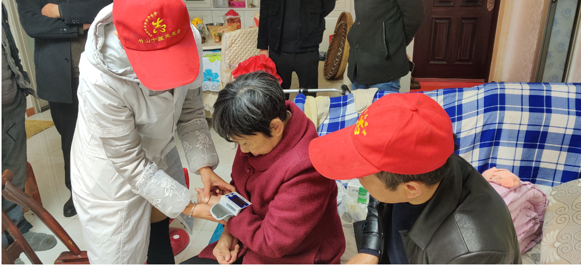 今日竹山网消息12月14日一早,笔者来到城关镇东门社区吉安花园小区内,看到一群身穿“白大褂”,头戴小红帽的志愿者,正在入户为该小区的孤寡、行动不便的老人量血压,了解老人身体状况、生活情况,并为老人送上日常常用药品,细心叮嘱老人药品使用方法和日常生活注意事项。