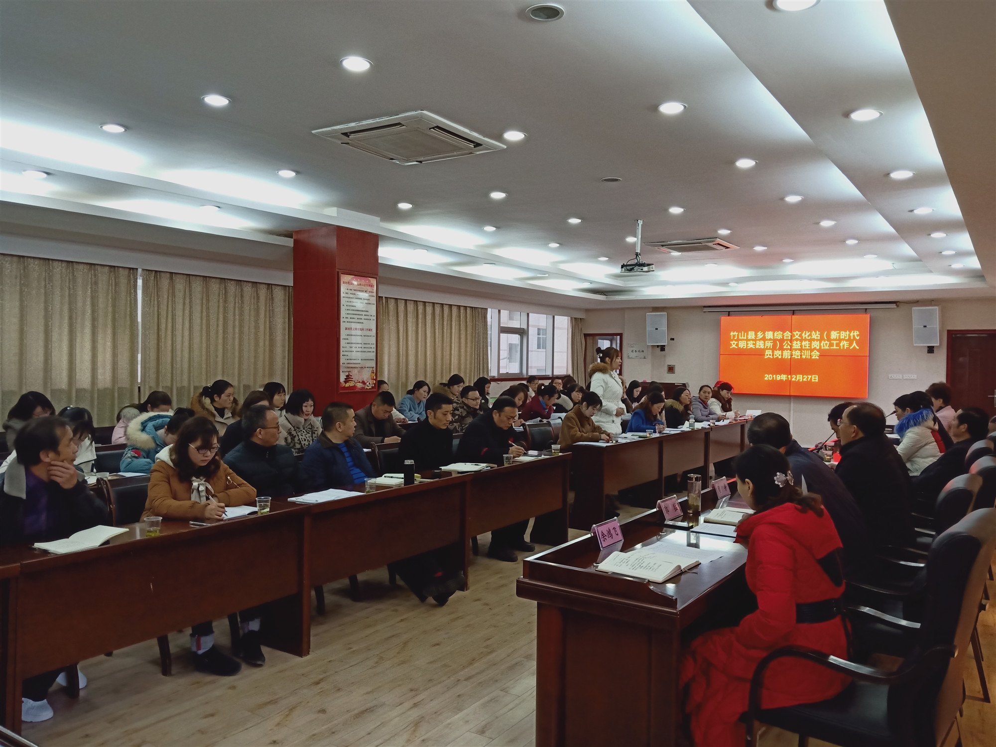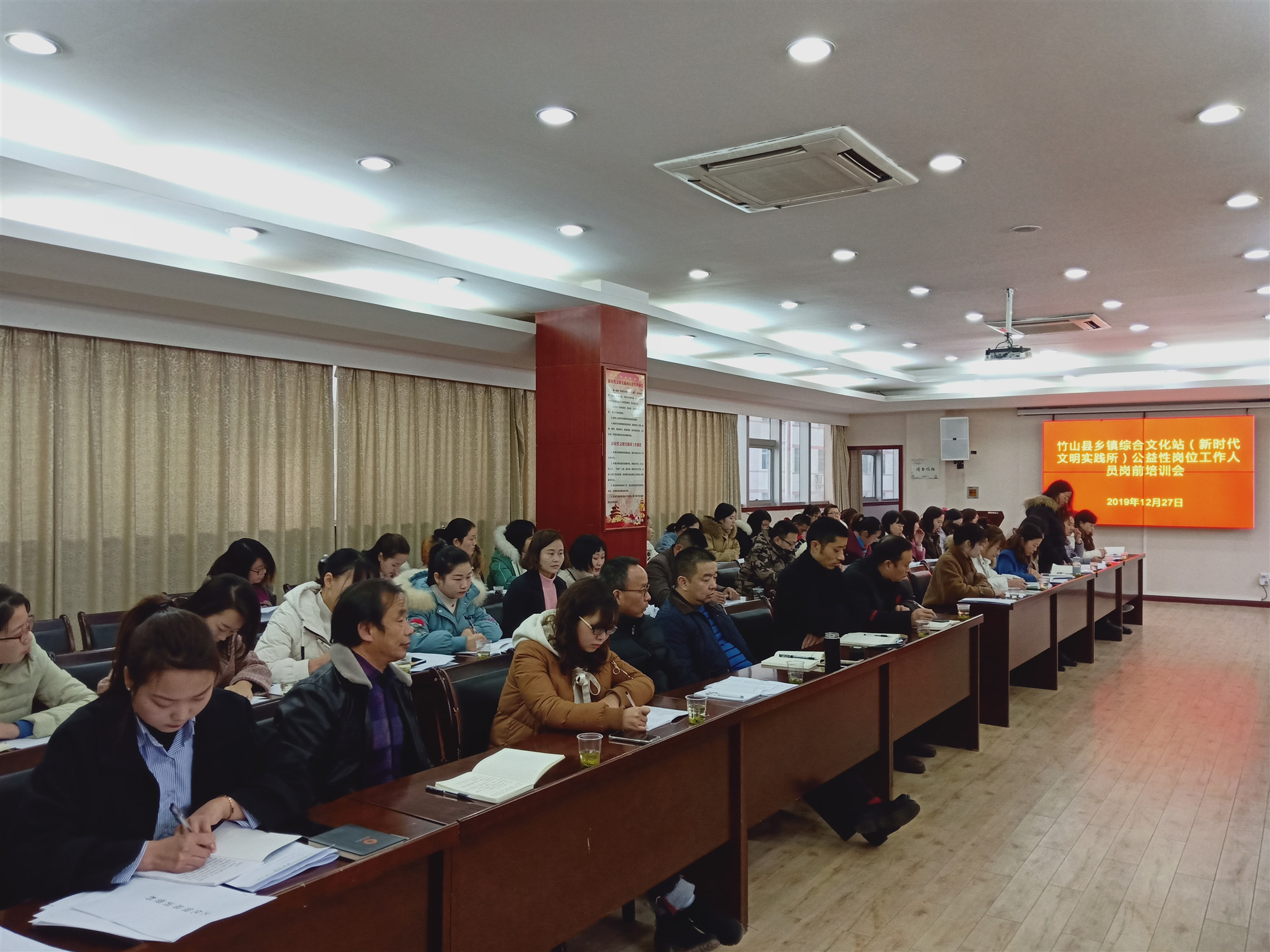 今日竹山网消息 27日,竹山县文化旅游局会议室里传出阵阵掌声,竹山县新招聘的34名乡镇综合文化站(新时代文明实践所)“以钱养事”公益性岗位工作人员正在进行岗前培训。
