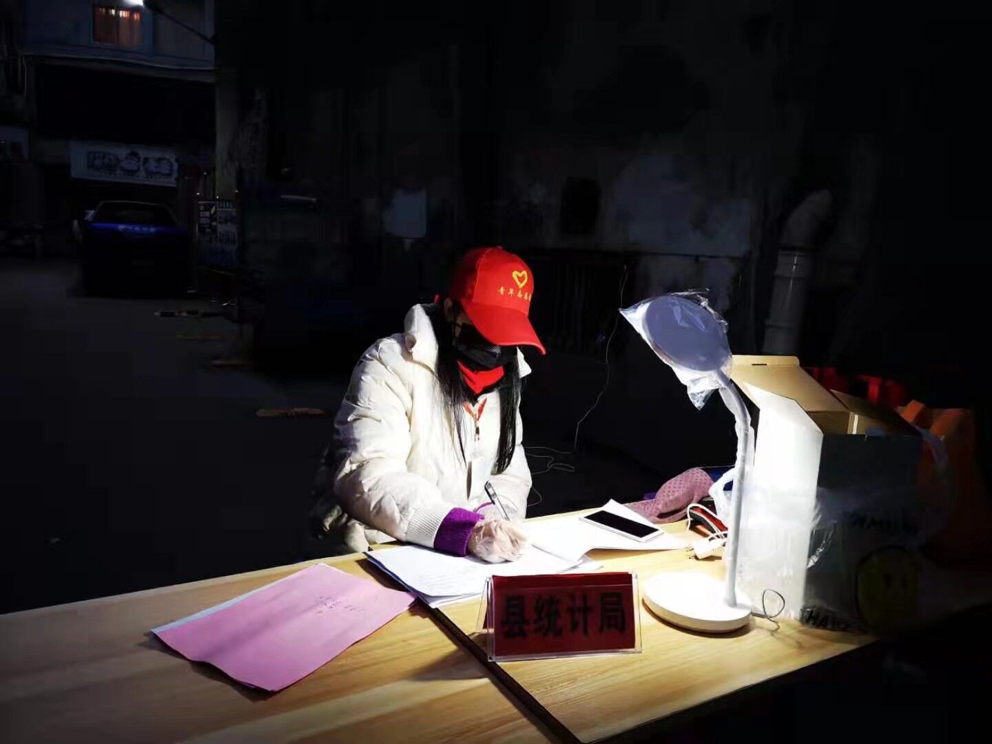 (图)2月7日傍晚,在竹山县北大街社区人民路烟草局侧面的柳家院小区,一盏泛着弱光的台灯、头戴小红帽的统计局执勤人员郭冉,戴着口罩,在夜色中,静悄悄的,独自一人坐在小区门口,低着头,正在默默而仔细地做登记,非常专注,连笔者走到她身边也亳无察觉。