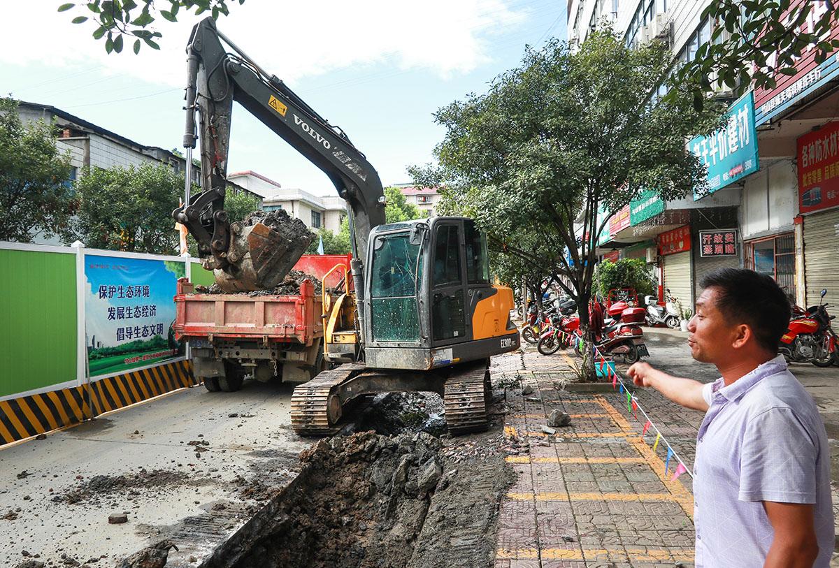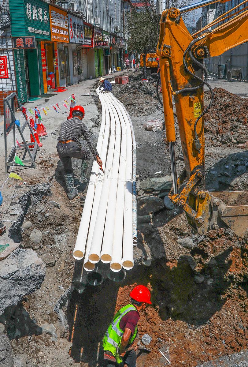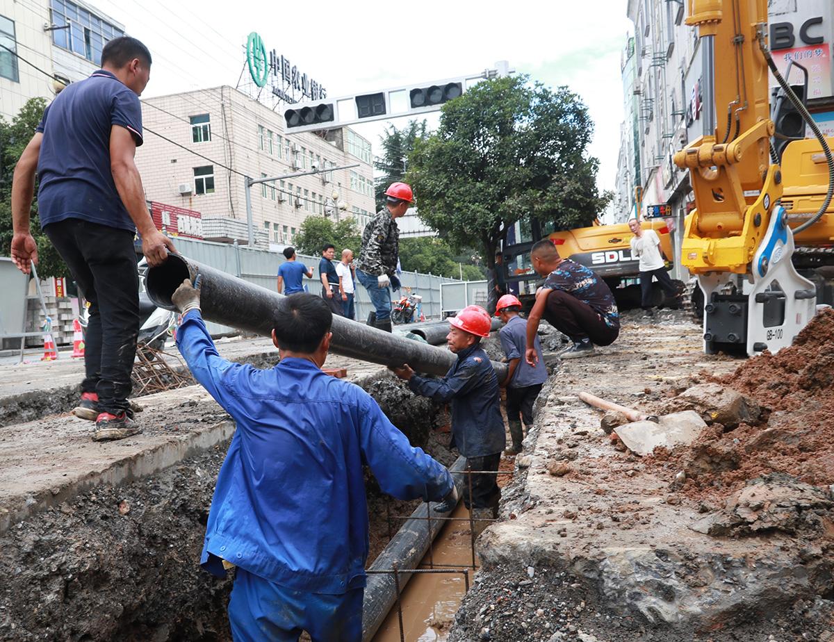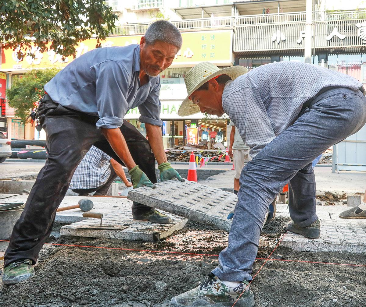 今日竹山网消息 8月9日,人民路改造施工现场,热浪滚滚,建设工人冒着酷暑,开挖管道、铺设路面、安装设施。人民路综合改造项目东至堵河大桥东头,西至城西水厂,道路全长2700米。施工设计主要包含人民医院门口和北大街口建设2处人行天桥、原路面实施黑色化改造、人行道铺装火烧板、高压线入地、沿线设置绿化带、防护格栅等建设内容。至8月上旬,工程已完成60%,工程规划预计于9月20日前全面竣工。(邵义龙 李 力)