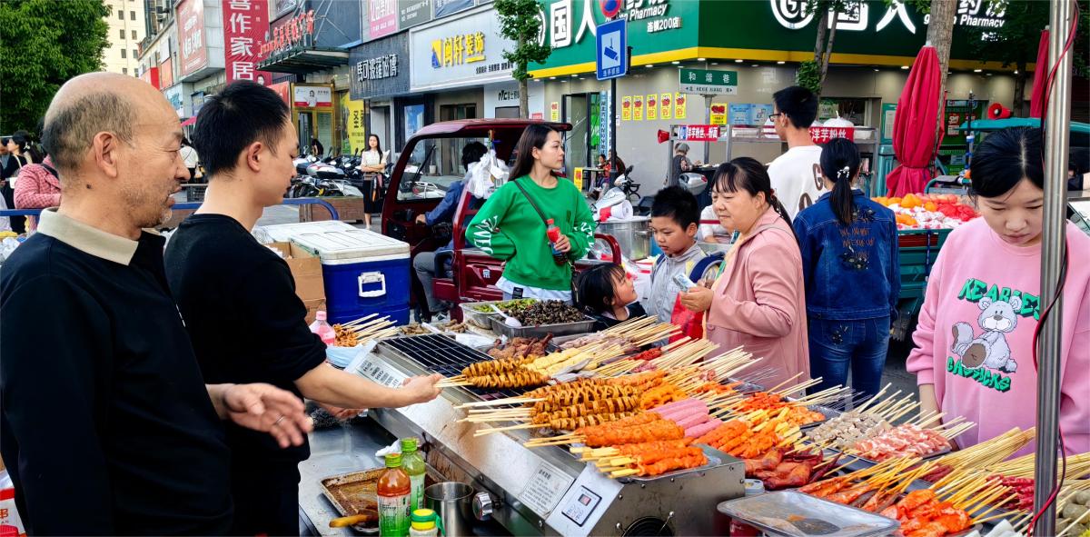 “平时每天烤1000串左右,五一假期生意特别好,每天大概在4000串左右,业务量比平时翻了好几番。”高强高兴地向记者介绍,因为他们的摊位临近桃花源街区,是游客必经之地,今年恰逢五一开街,生意特别火爆,假日里忙不过来,他就把自己的小姨蒋奇云请过来帮忙。