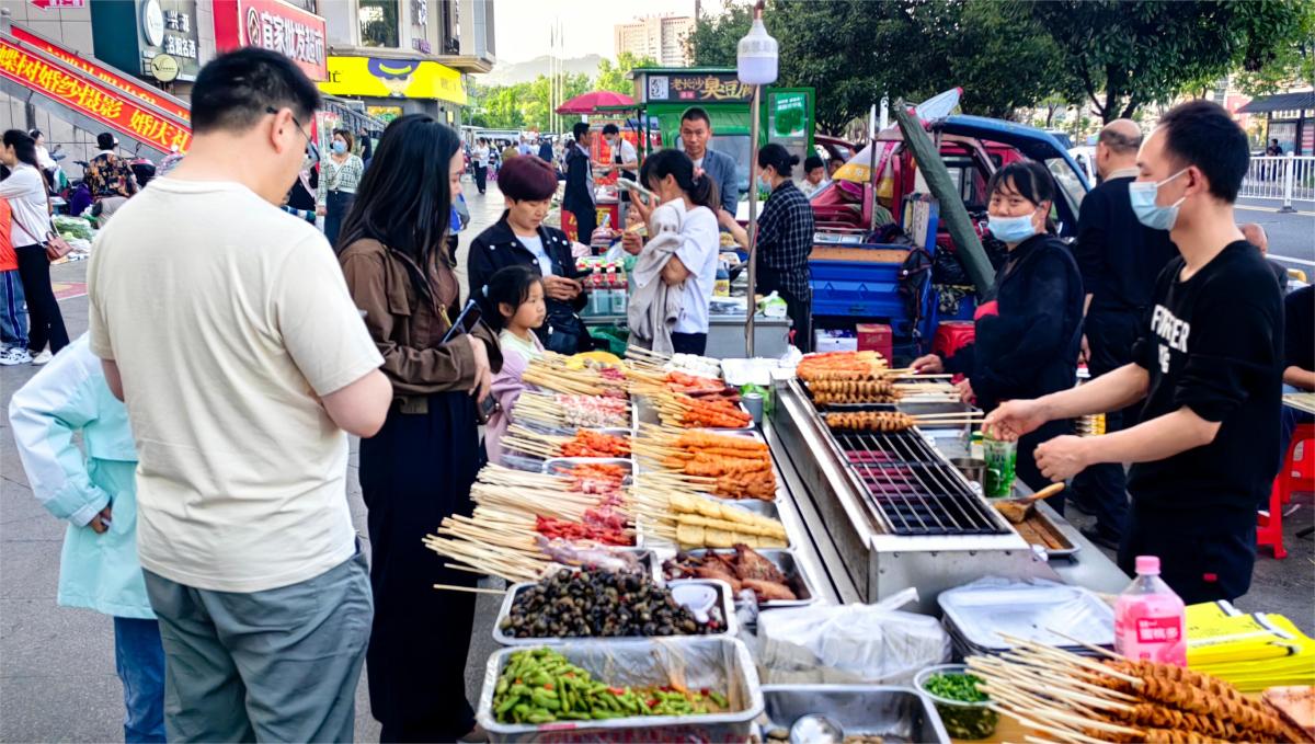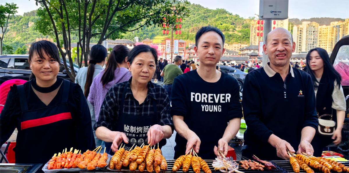 今日竹山网消息 今年“五一”假期,随着桃花源街区的盛大开街,城区夜市迎来人流量高峰,家住城关镇莲花社区的高强和父母,瞄准商机在家门口开起了烧烤摊,凭着家传的烧烤手艺,不仅俘虏了无数食客的口腹,还在这个假日大赚了一把。
