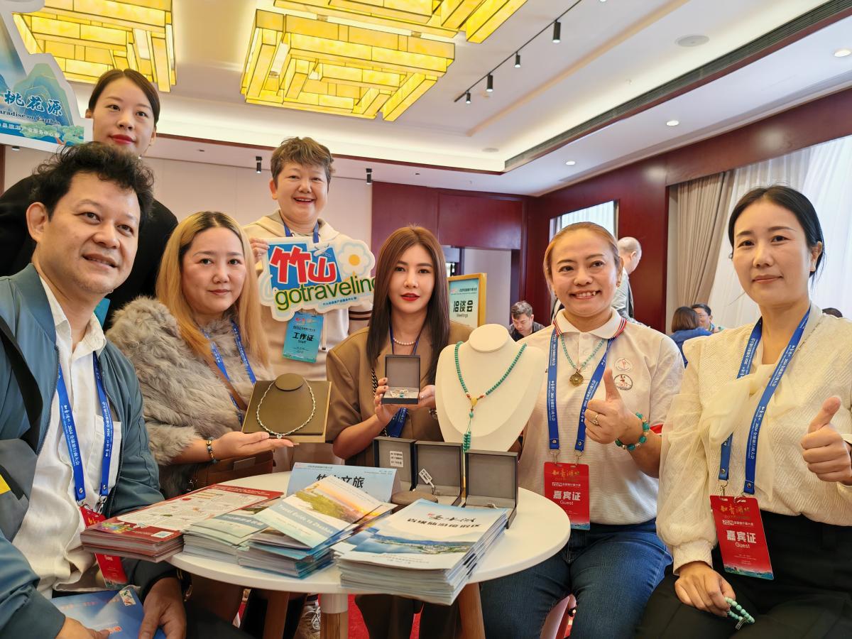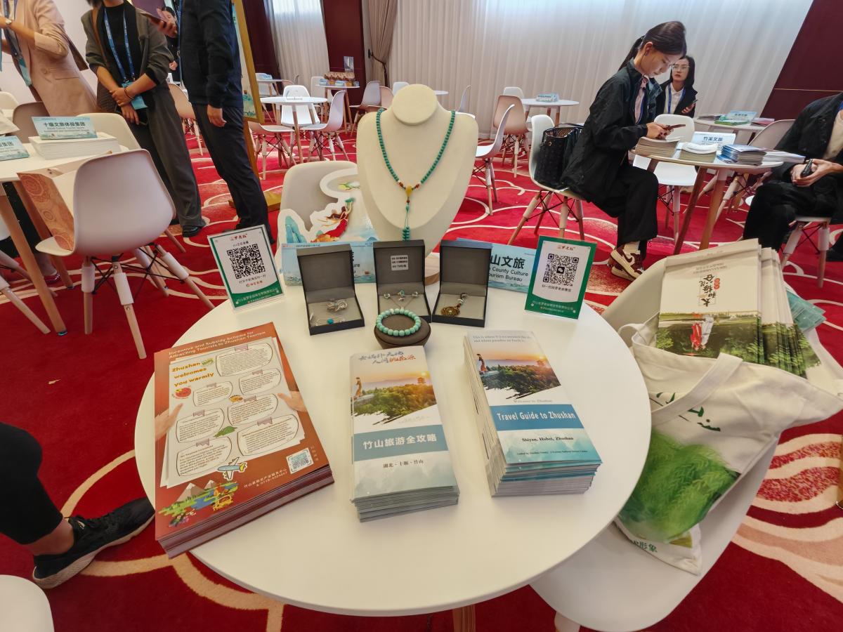 会议期间,竹山县代表团向参会者介绍了县内的10个a级景区景点、5个旅游名村以及10条精心规划的旅游线路。同时,还介绍了绿松石为代表的旅游文创商品。