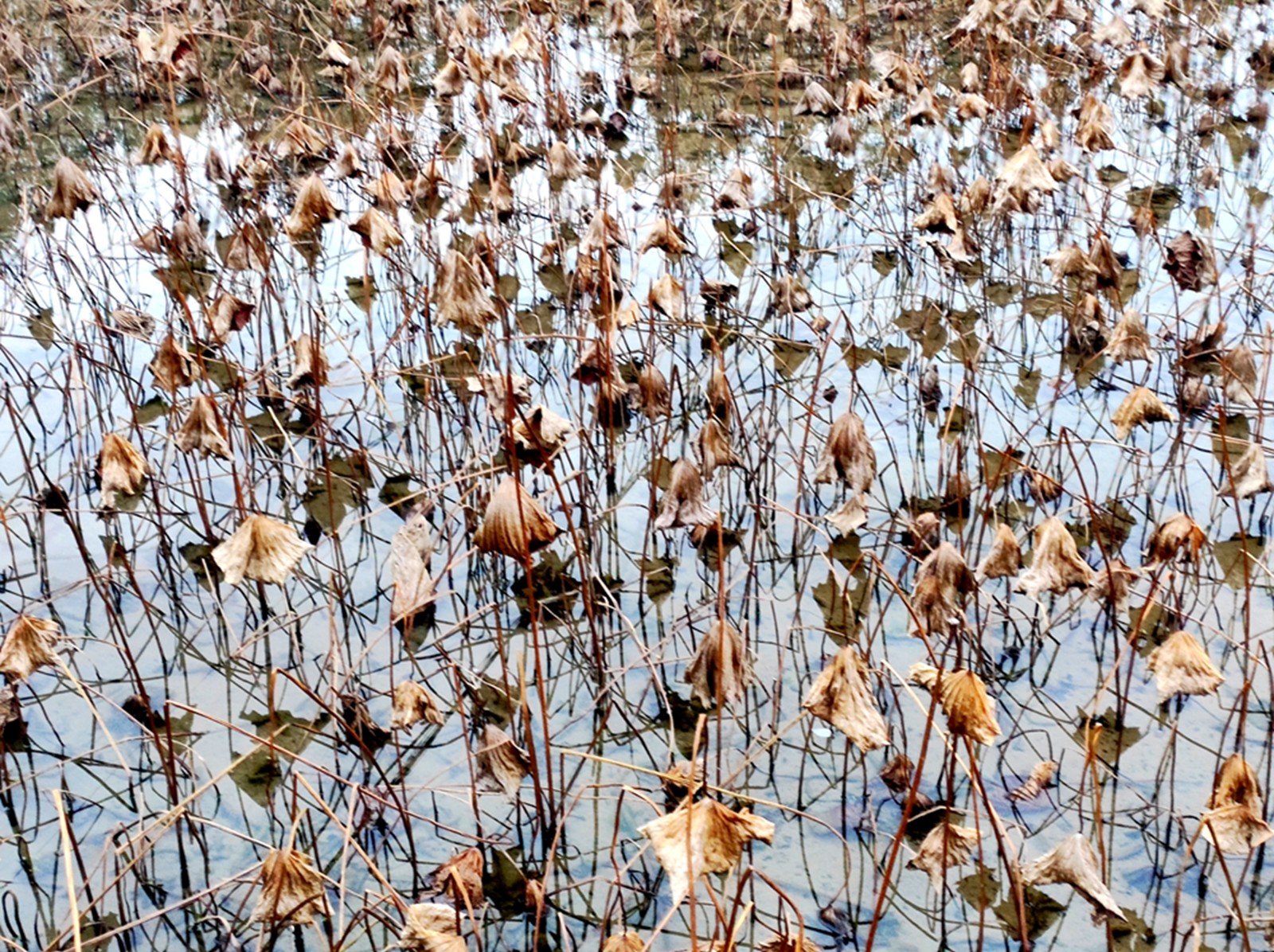 曾经亭亭玉立的荷叶,如今虽已泛黄卷曲,却依旧傲然挺立,承载着岁月的沉淀。断梗残叶间,依稀可见夏日盛放的痕迹,每一道纹路都镌刻着生命的坚韧。偶尔有寒鸟掠过,停驻在荷竿之上,清脆的鸟鸣打破了荷塘的静谧,更显清幽。