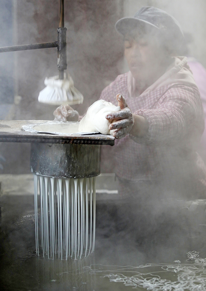 1·将拌合好的淀粉糊,通过漏孔呈条状落入沸水锅中,是粉丝加工成型的重要环节。