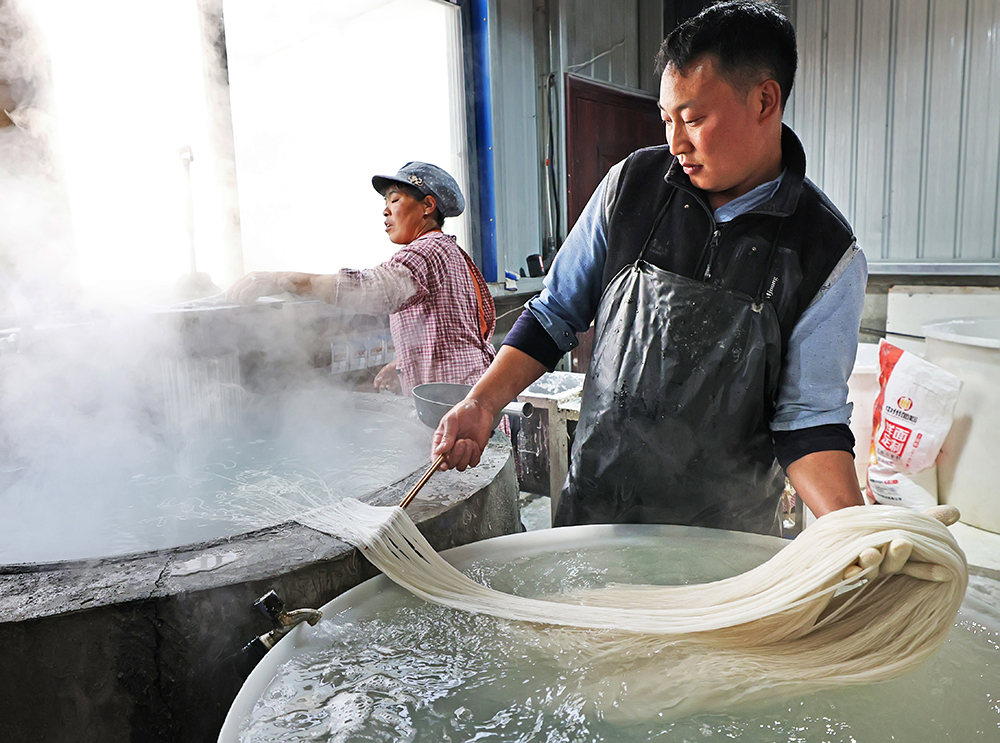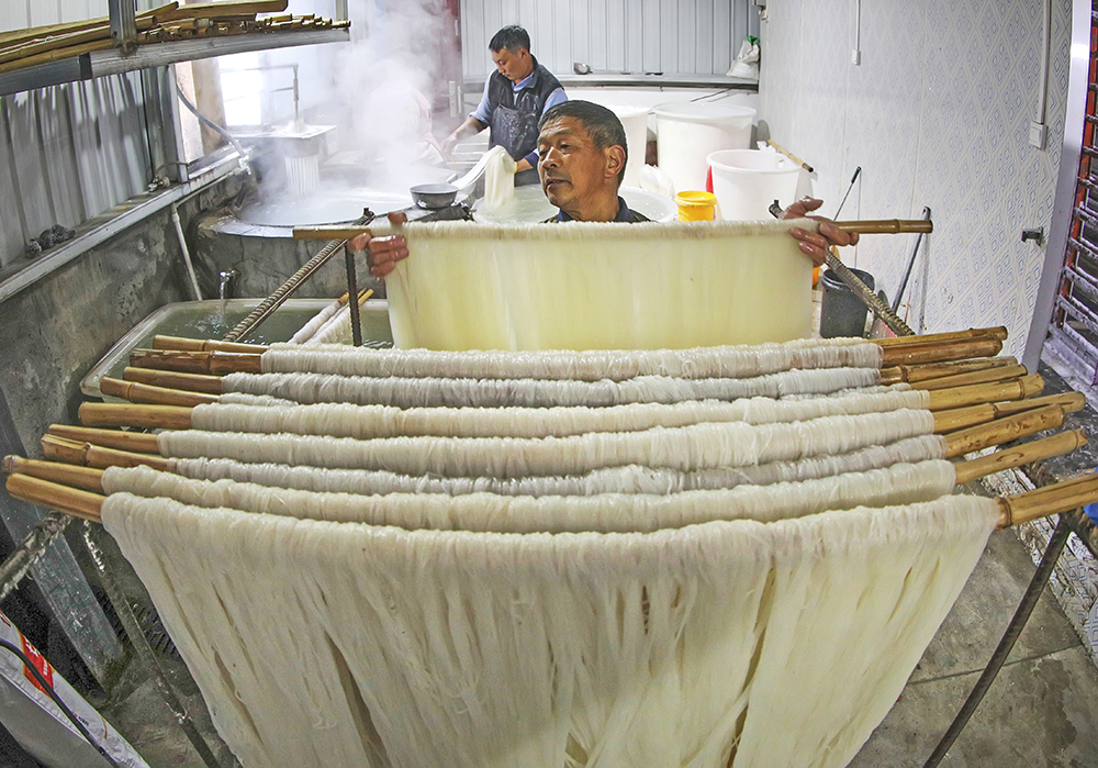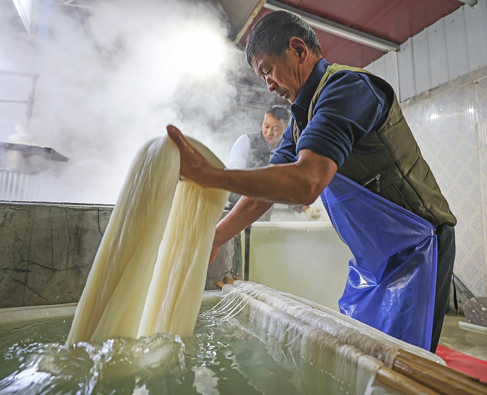 2·文家旺(右)将刚刚成型的粉丝用筷子轻轻挑起,再拖入盛满冷水的缸中。