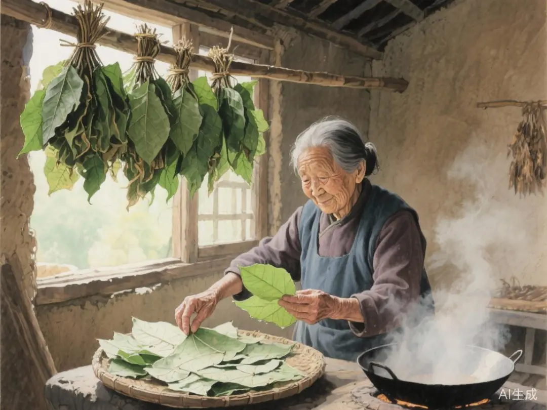 母亲每年采摘完整叶片,晒干扎捆,高悬房梁,如同珍藏绿色信笺。用时滚水烫软,剪去叶梗,铺展掌心,便是天然“蒸皮”。