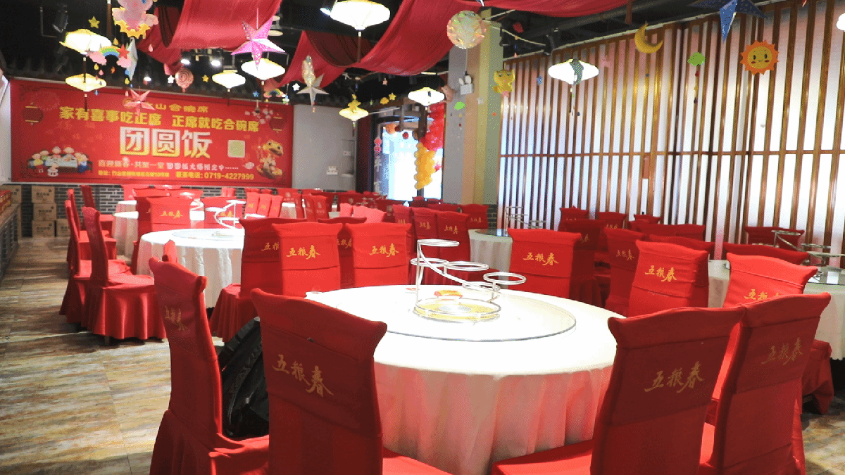 在桃花源街区的合碗席店内,大厅悬挂的巨幅团年饭宣传海报格外醒目。后厨里,员工们正有序进行各项准备工作,清洗、切配、备料,忙碌却秩序井然。