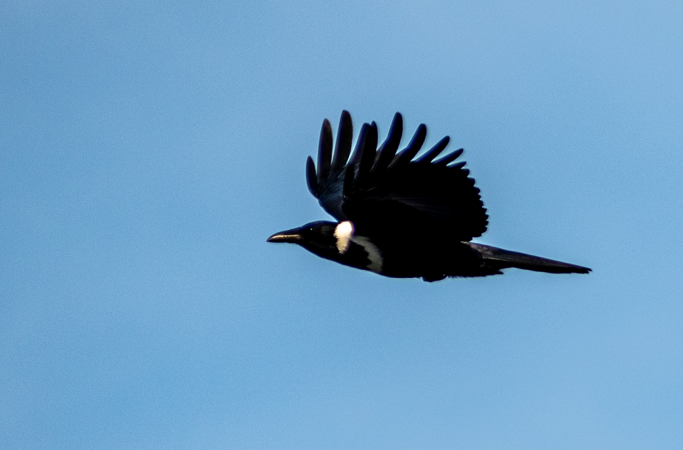 连日来这两对白颈鸦每日清晨与傍晚准时在湖面周边活动,时而停留在岸边、渡口船舷上、时而低头觅食,时而低空盘旋飞行,状态十分稳定。白颈鸦通体以黑色为主,仅颈后、上背、颈侧及前胸环绕一圈白色羽毛,形成鲜明颈圈,辨识度极高。该鸟类属雀形目鸦科,体长约48厘米,多栖息于平原、河滩、村镇周边,常单独或成对活动,极少集群,主要以植物种子、昆虫等为食。