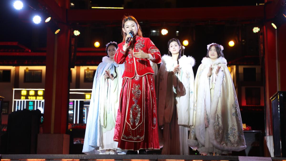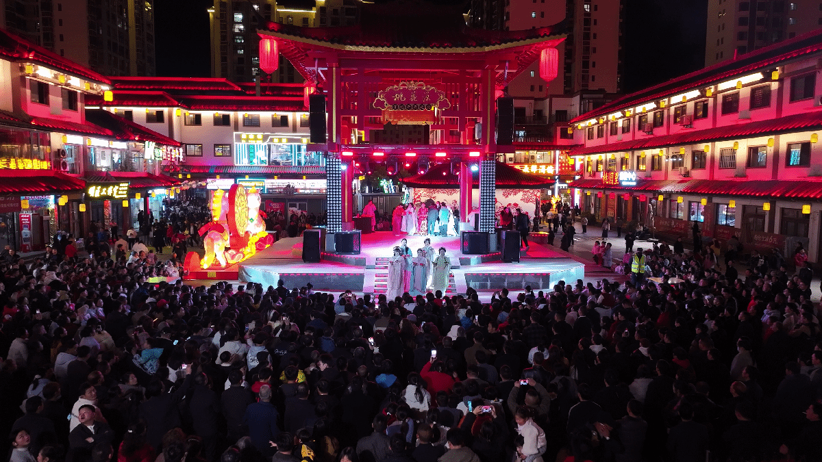 今日竹山网消息  元宵节当晚,桃花源街区源外园广场华灯璀璨、篝火熊熊,本土特色演出《遇见竹山》温情开演。经典剧目搭配投壶、嫁娶民俗等互动,让观众沉浸式欢度元宵,感受竹山文化魅力。