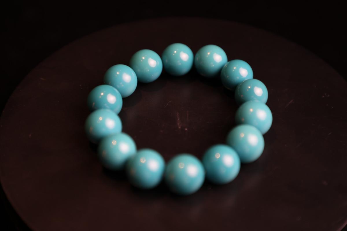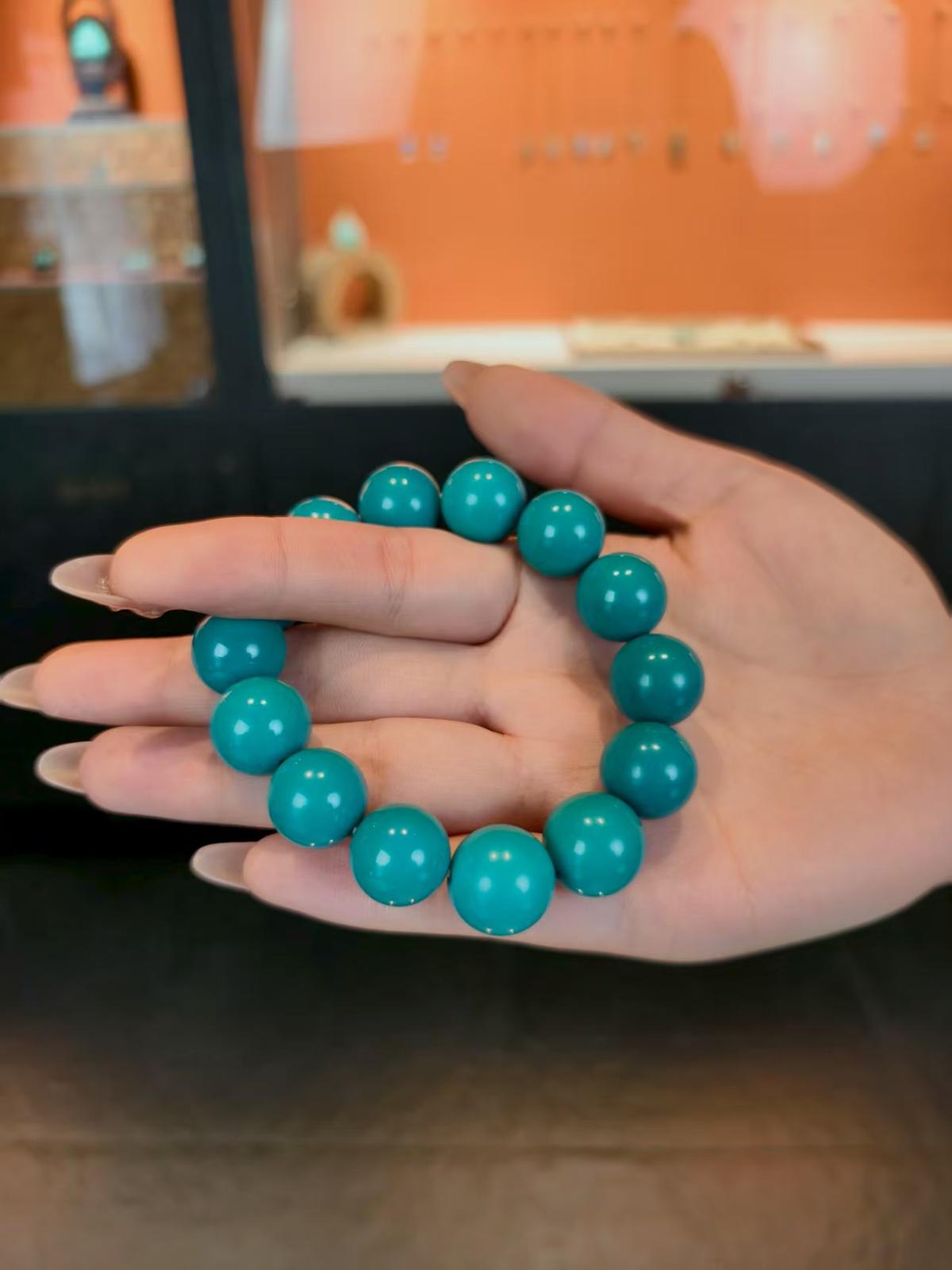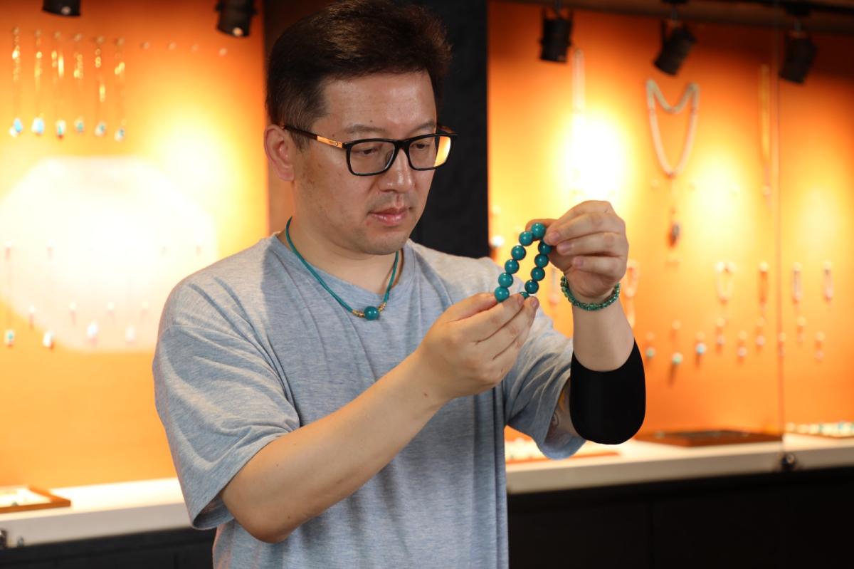 “这个品质的手串在全中国只此一条,因为我们绿松石是天然的宝玉石,它表面上或者内部都会带有一些比如天然的铁线,天然的白,天然的一些俏色,或者是大自然的一些小瑕疵,但是这条手串通体360度,每一颗珠子都是极致的完美无瑕,且它的色泽和玉化度已经达到宝石级别。”易禅居松石珠宝店负责人陶磊介绍。