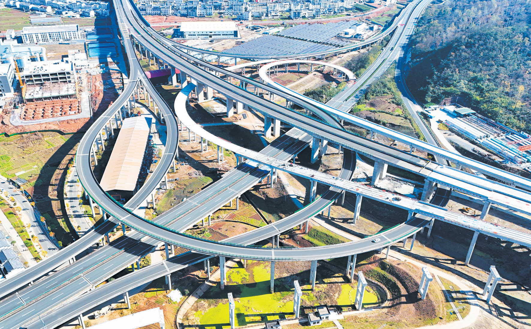11月22日,记者在竹山县溢水镇十巫南高速公路与谷竹高速公路互通项目建设现场看到,匝道如盘龙叠绕、纵横交错,互通枢纽主体轮廓已清晰展现,气势初显。作为串联鄂陕渝省际通道关键节点,该互通工程桩基施工基本结束,t梁架设进入收官阶段。(张建波 摄)