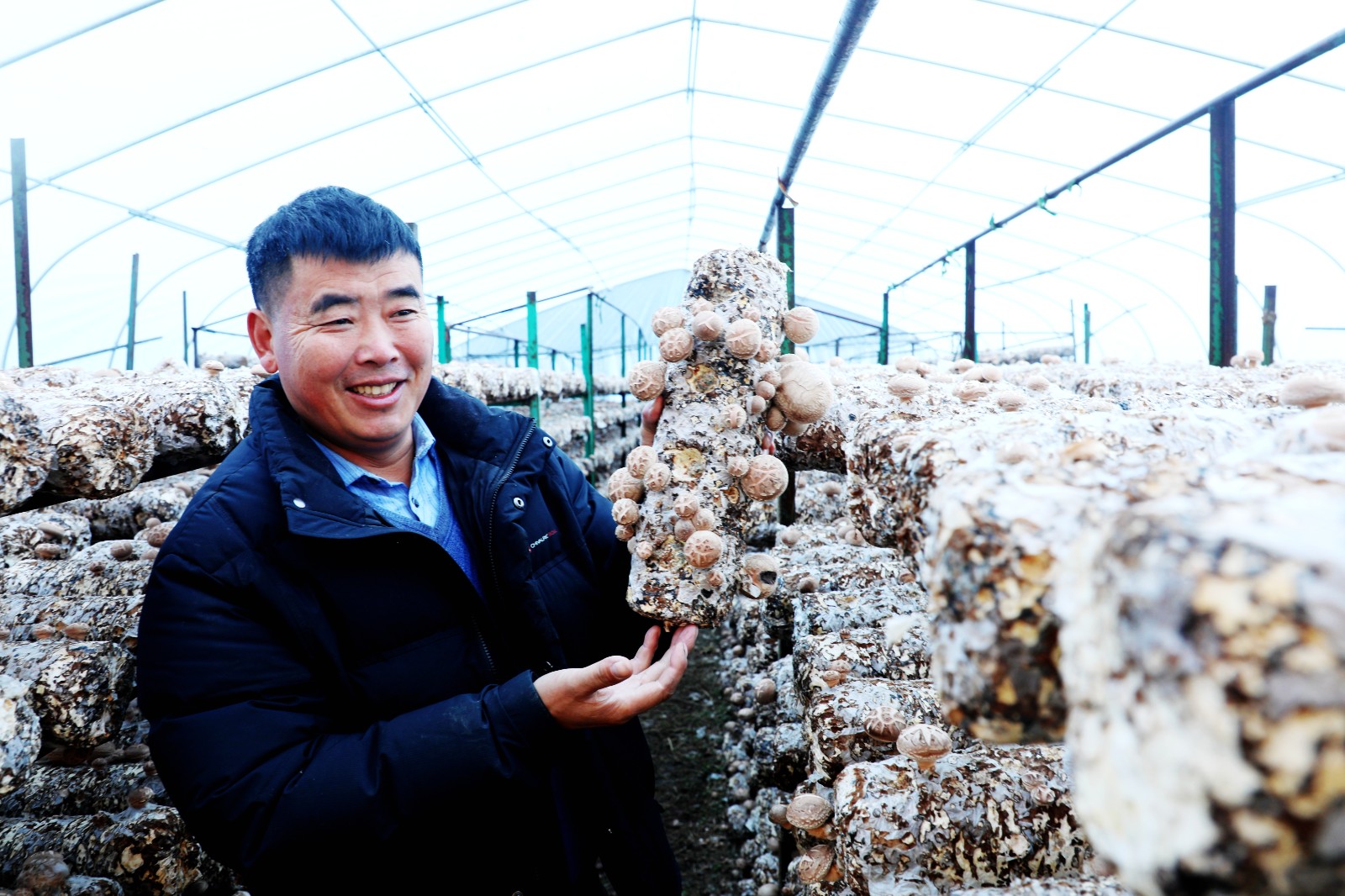 湖北民心生态农业科技有限公司位于潘口乡龙王沟村,是一家专业从事食用菌生产的民营企业,有基地近300亩。在该公司的水晶沟袋栽香菇出菇基地,尽管时至寒冬,棚膜上还挂着白花花的明霜,大棚内的菇架上,小香菇却一个个探出小脑袋、争先恐后地争相生长,一派生机盎然景象,让人看了不禁眼前一亮,顿时觉得暖和了许多。负责基地管理的文隆鑫,正在组织员工采摘香菇,有的棚外已经摆满了一筐筐刚采下的小香菇。“我们这个基地种植的10号香菇,不仅出菇密集、产量很高,而且较耐低温、菇型圆整,肉质紧实、香气浓郁,花菇率高,既好看又好吃,每年到这个季节都特别俏销。”文隆鑫从菇架上拿起一个长满香菇的菌棒,向笔者热情地介绍。