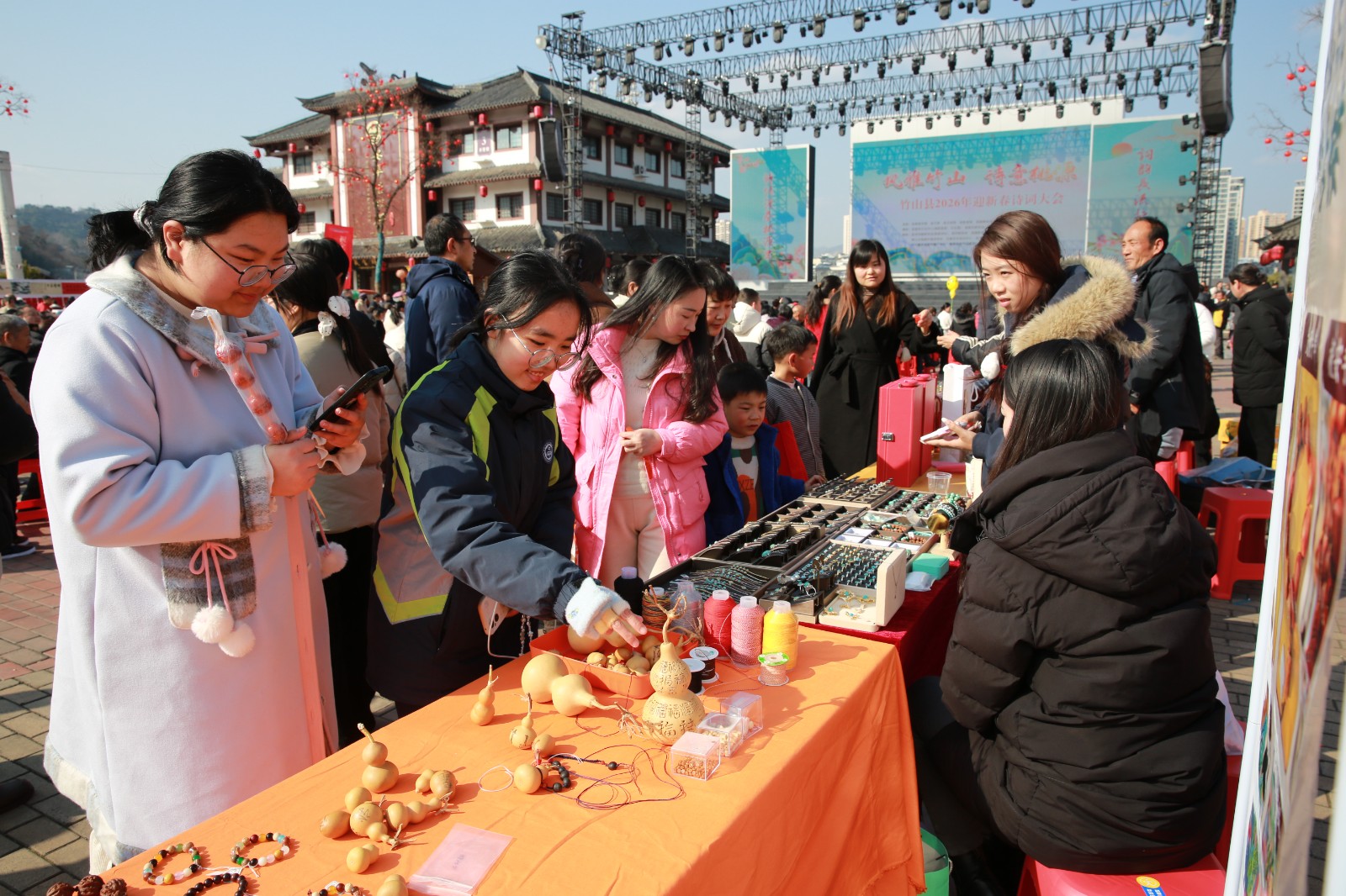 1月24日,我县2026年迎新春诗词大会在桃花源街区女娲广场启幕,同步联动年货节展销活动,以诗词为媒,拉动文旅消费,全方位展示竹山古韵新姿,实现“文化赏心”与“消费暖心”双向赋能。近年来,竹山以文化为媒激发市场活力,先后在女娲广场举办文旅促消费活动80余场次,为优化营商环境、拉动县域经济发展、服务支点建设发挥了重要作用。(章 伟 摄)