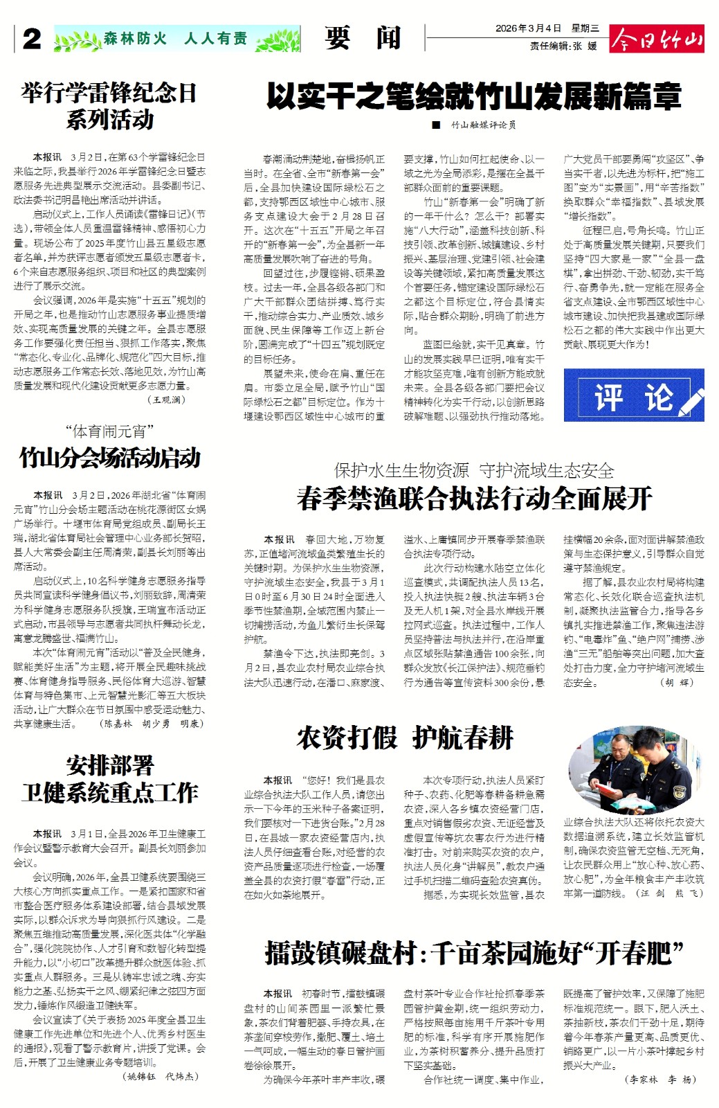 竹山“新春第一会”明确了新的一年干什么?怎么干?部署实施“八大行动”,涵盖科技创新、科技引领、改革创新、城镇建设、乡村振兴、基层治理、党建引领、社会建设等关键领域,紧扣高质量发展这个首要任务,锚定建设国际绿松石之都这个目标定位,符合县情实际,贴合群众期盼,明确了前进方向。
