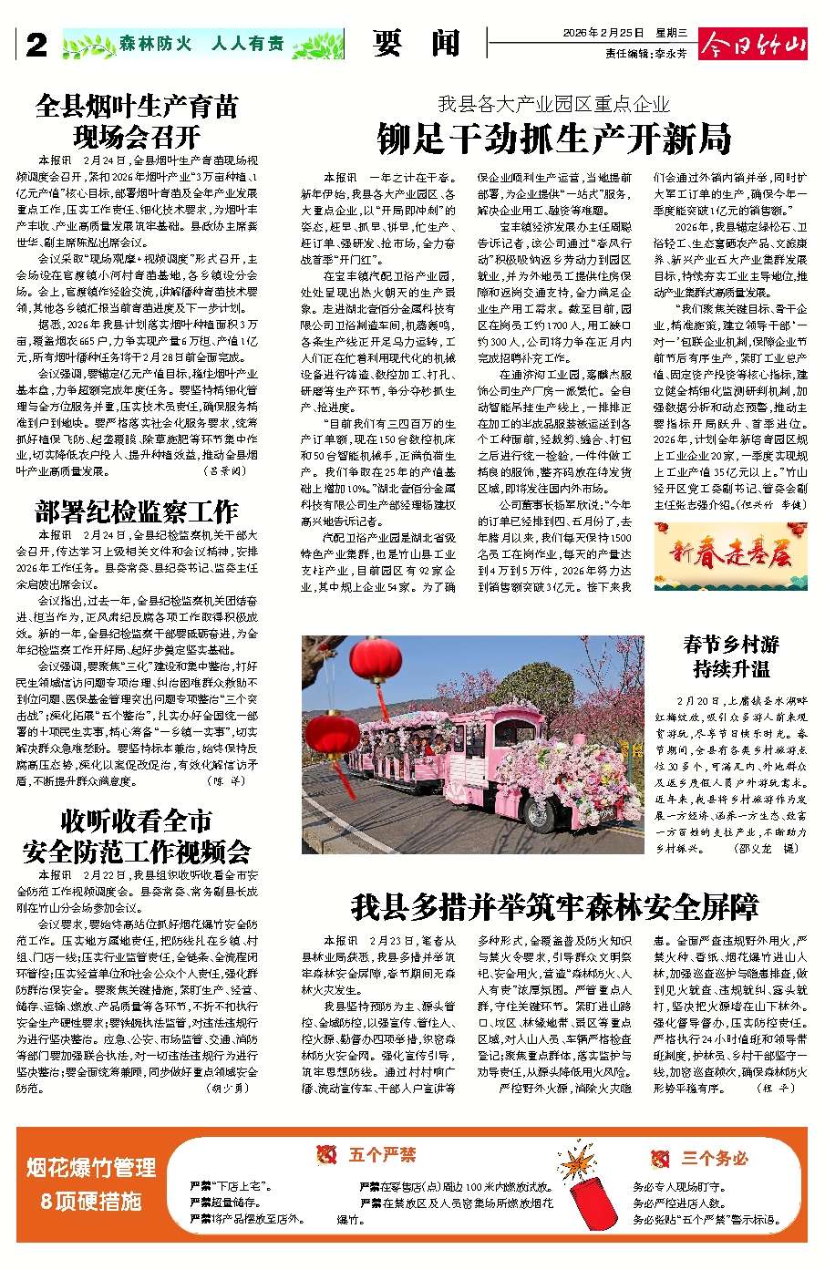 会议要求,要始终高站位抓好烟花爆竹安全防范工作。压实地方属地责任,把防线扎在乡镇、村组、门店一线;压实行业监管责任,全链条、全流程闭环管控;压实经营单位和社会公众个人责任,强化群防群治保安全。要聚焦关键措施,紧盯生产、经营、储存、运输、燃放、产品质量等各环节,不折不扣执行安全生产硬性要求;要铁腕执法监管,对违法违规行为进行坚决整治。应急、公安、市场监管、交通、消防等部门要加强联合执法,对一切违法违规行为进行坚决整治;要全面统筹兼顾,同步做好重点领域安全防范。 (胡少勇)